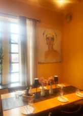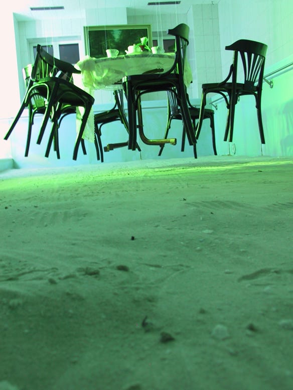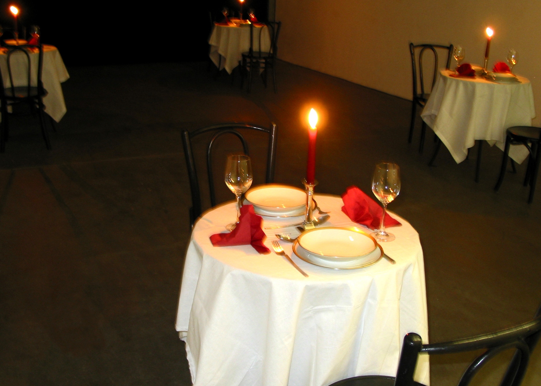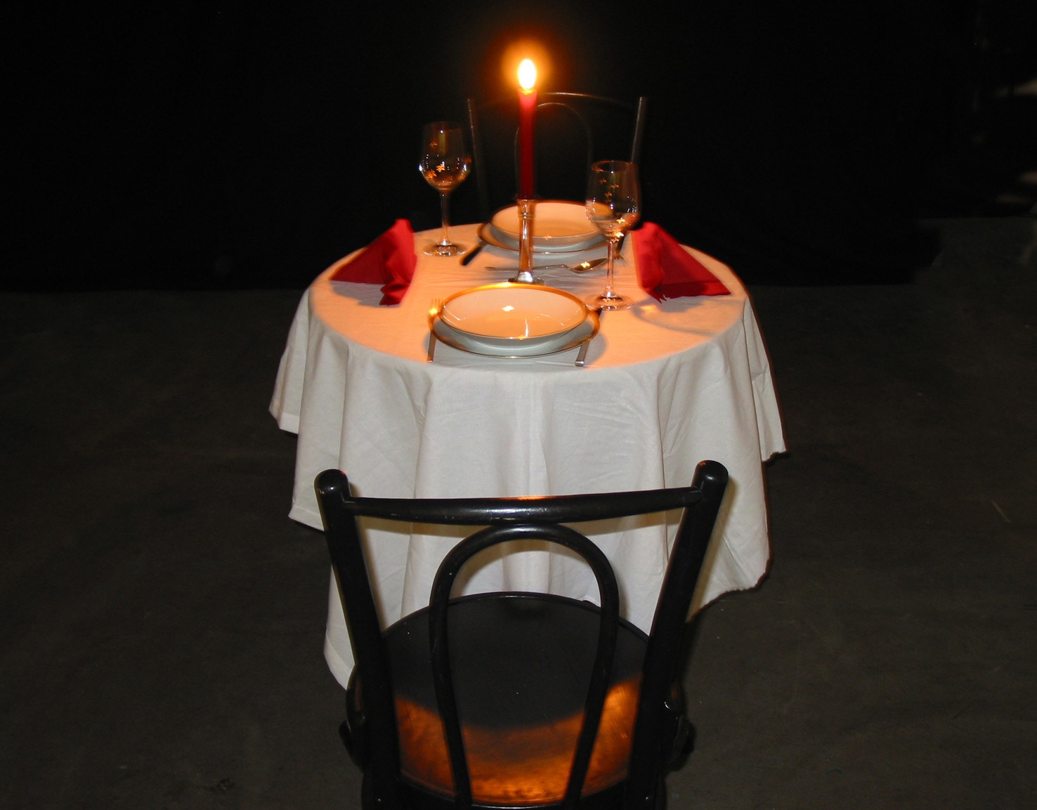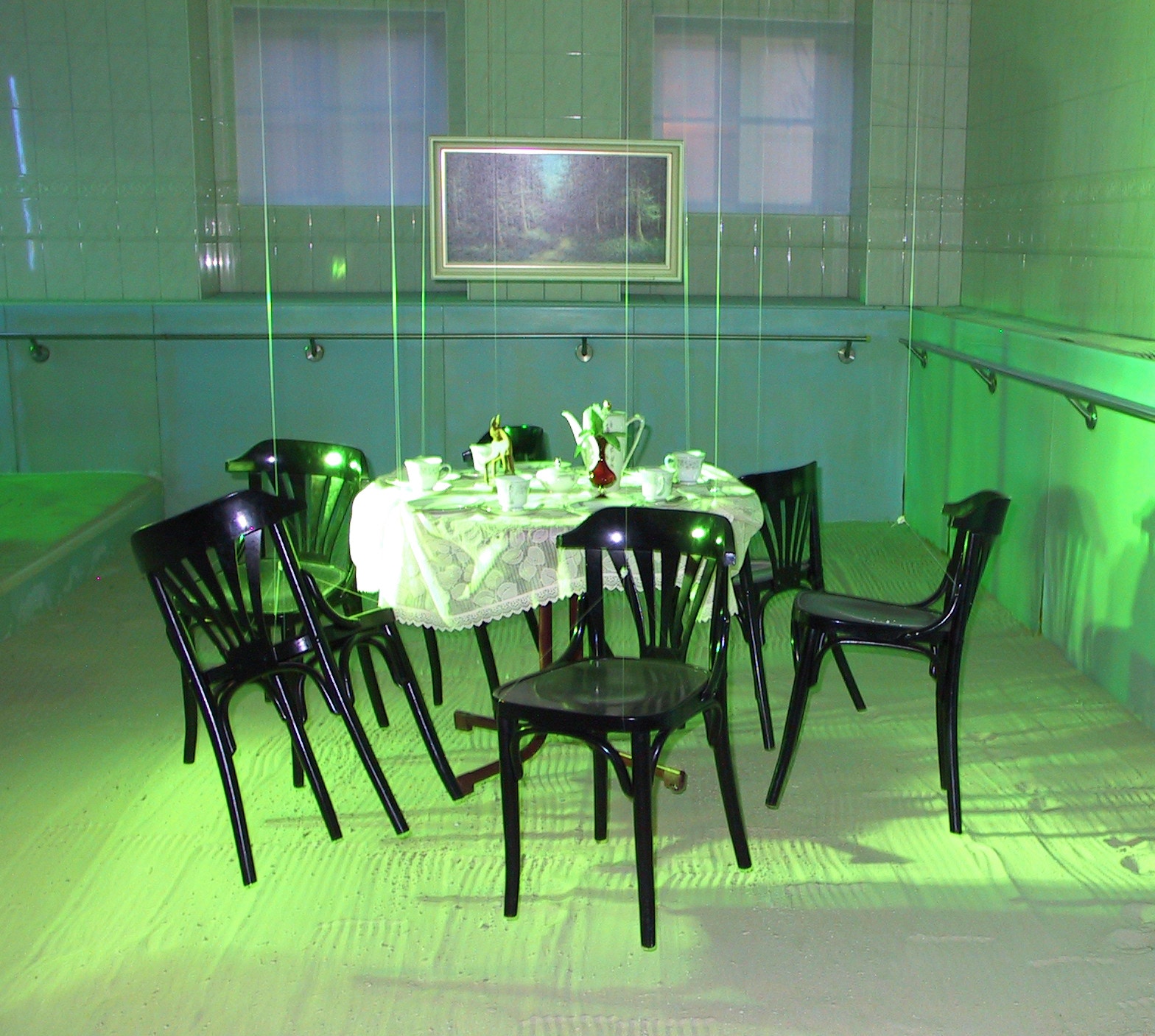 Vier gedeckte Restauranttische, an denen gleichzeitig unterschiedliche Texte (Gedichte, Gespräche, Hörspiele) zu hören sind. Sie werden immer wieder von der selben Person gesprochen, es ist aber niemand körperlich anwesend. Bis auf den Besucher, der sich als Gast an die Tische setzen und dem jeweiligen Text zuhören darf. Der Besucher hat den Eindruck eines gefüllten Restaurants.