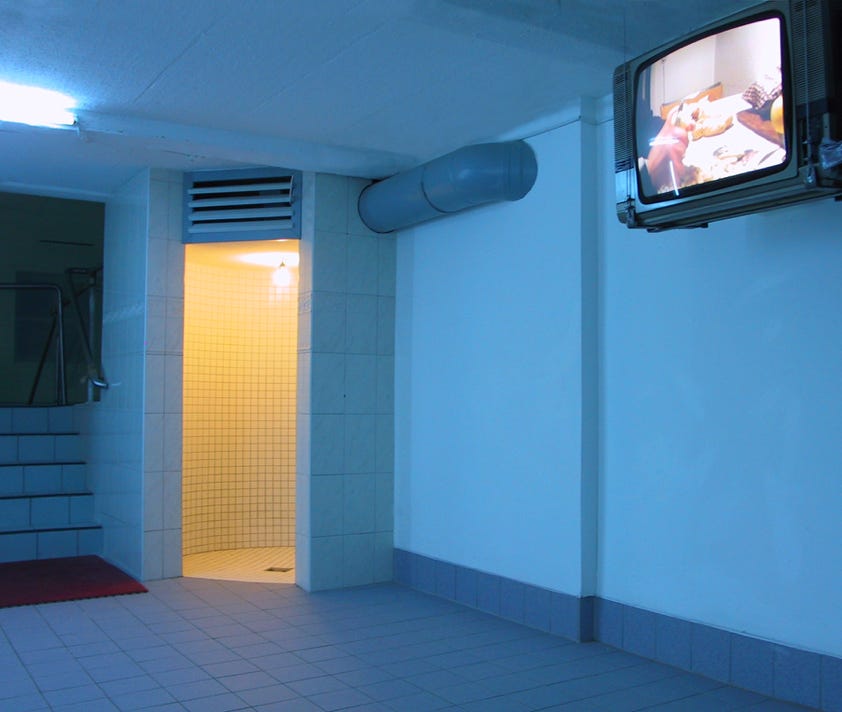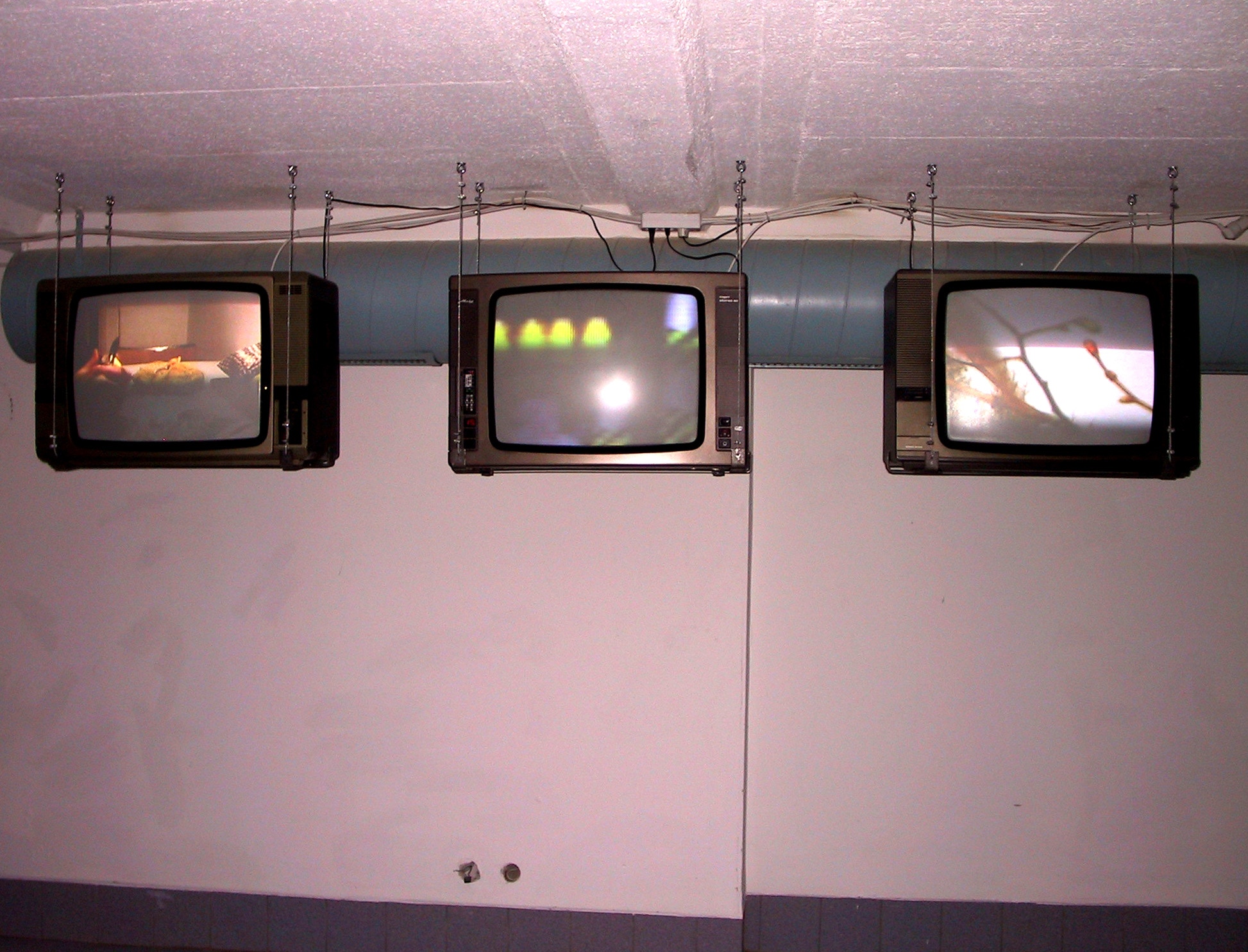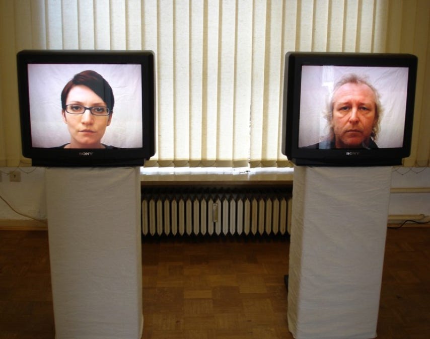 Im gesamten Raum stehen nur zwei Monitore. Beide Personen auf dem Bildschirm sprechen, schauen jeweils nur nach vorne, ohne sich anzublicken. Person weiblich links stellt Fragen wie: „Liebst Du mich?“, „Bin ich schön?“, „Fick mich!“, „Sag, dass Du mich liebst!“. Person männlich rechts: „Soll ich mich mal rasieren?“, „Mmm“, „Klar lieb ich Dich“, „Lass ma morgen drüber reden“.