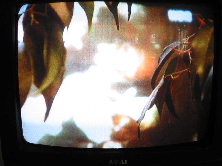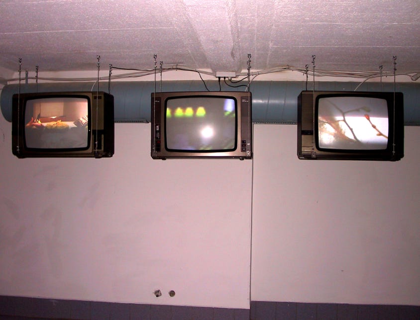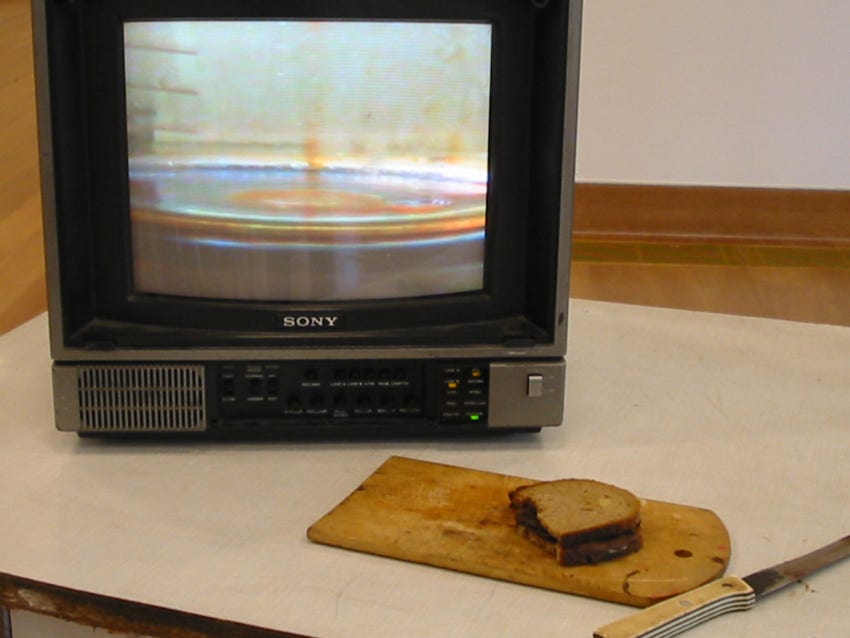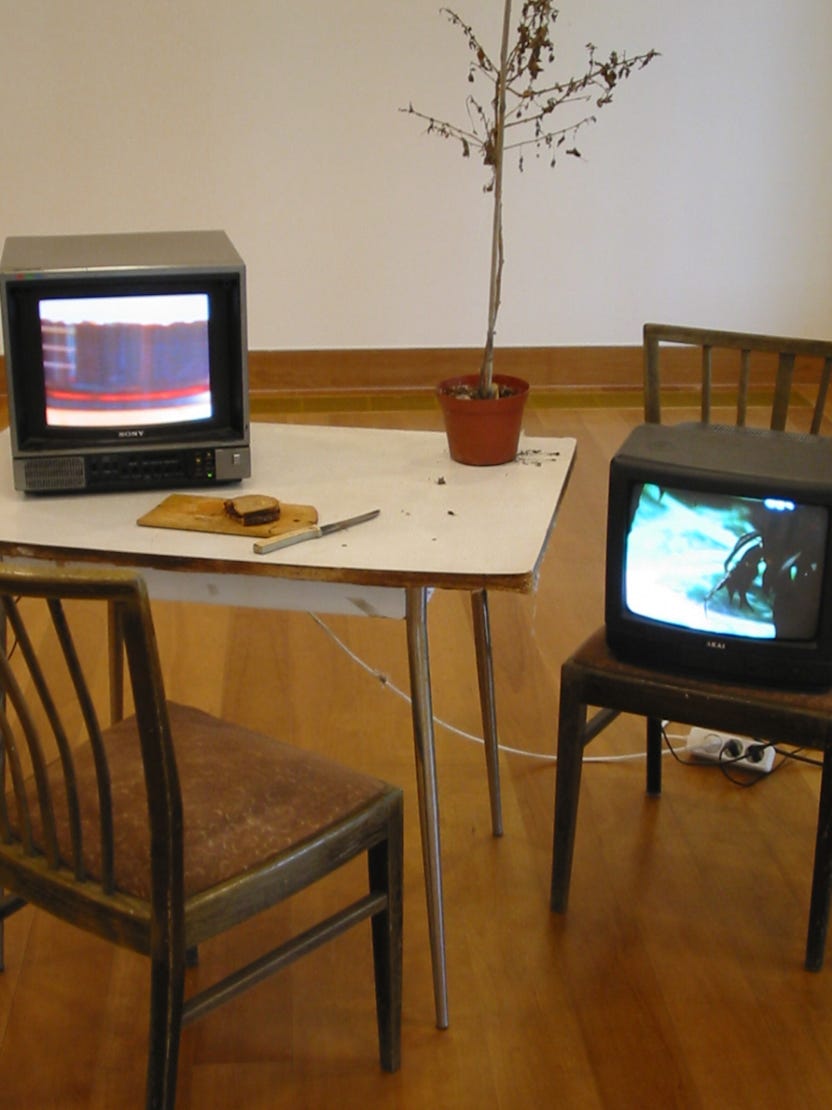 2 Fernseher, Frühstückstisch, Nutellabrot, Messer, Pflanze.
